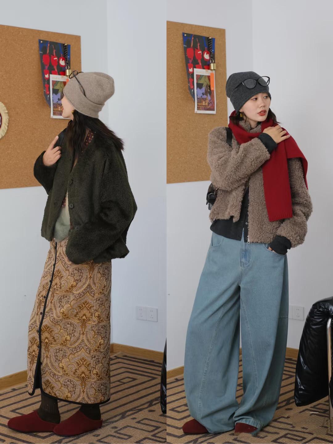 短款的毛毛外套,可以配直筒的半身裙、也可以配闊腿的牛仔褲。上短下長的組合很利落,配上針織的線帽或者紅色圍巾都很有新年氛圍。