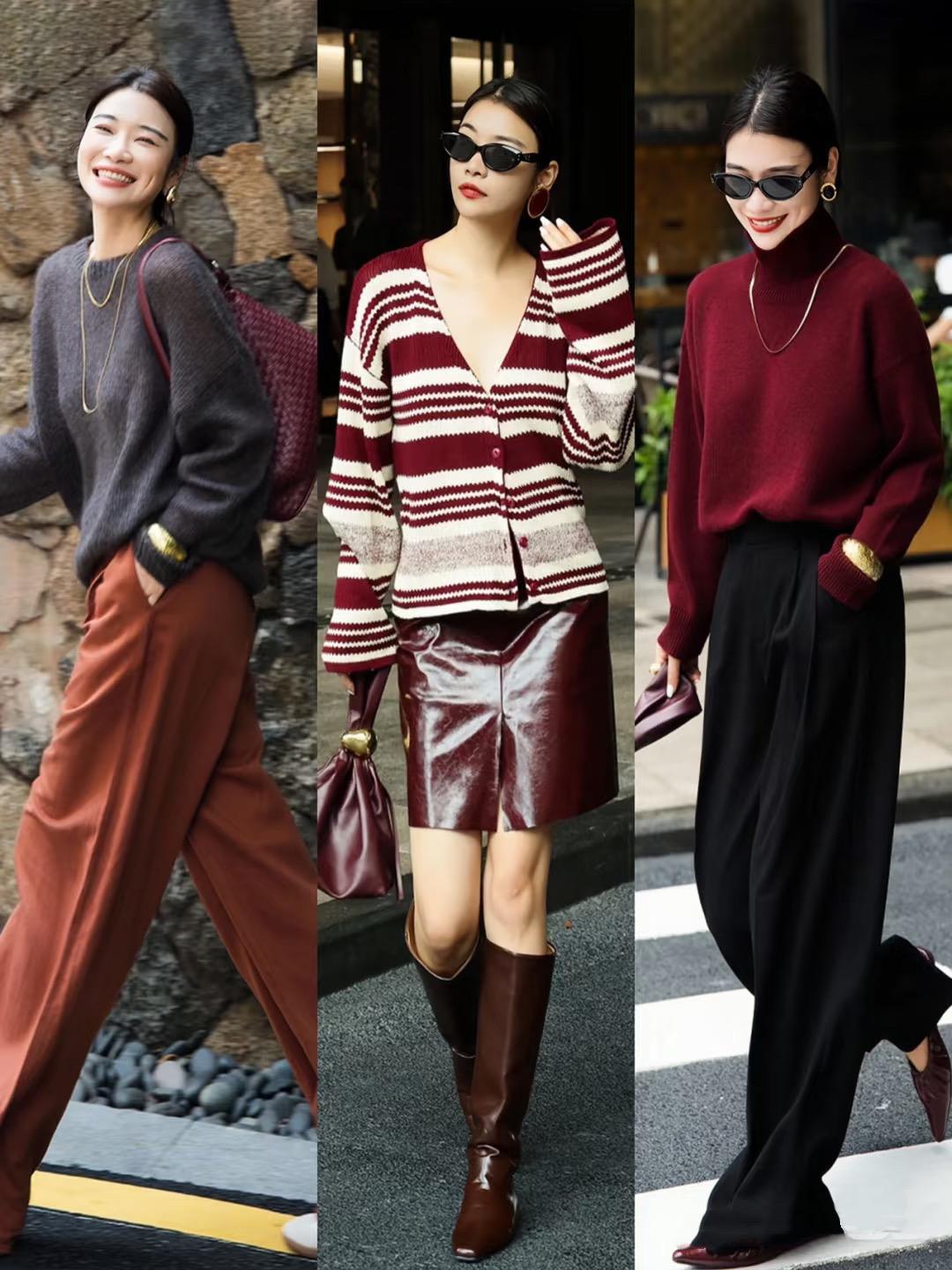 紅色系的毛衣、以及紅色的針織衫、半身裙、長靴,都可以安排起來。紅色毛衣,可以配紅色西裝褲,簡約高級又颯美。