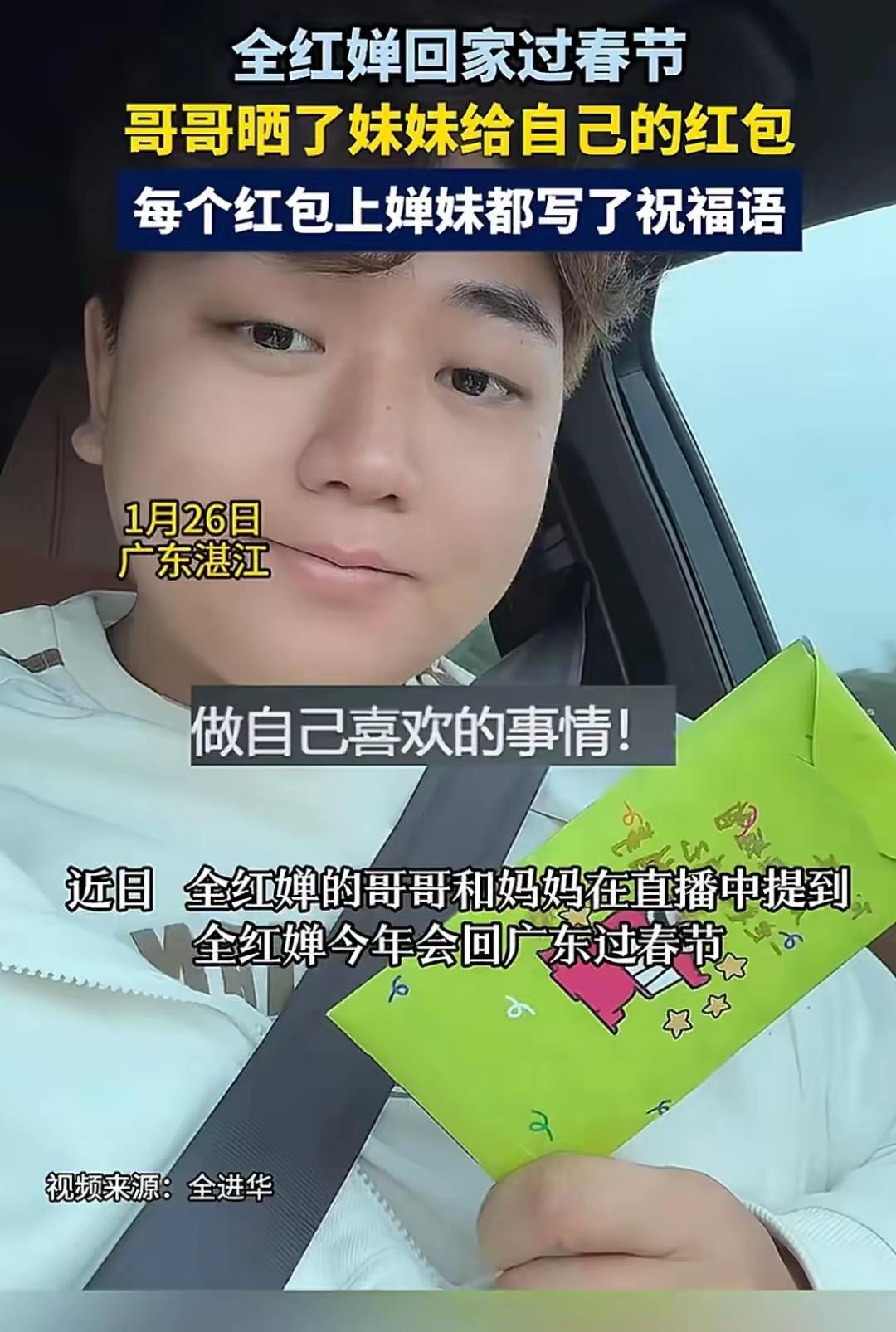 全紅嬋兄妹五個、排行老三,她既有哥哥姐姐、也有弟弟妹妹。回家過年的時候全紅嬋很貼心的給家人都包了紅包利是,包括哥哥姐姐。