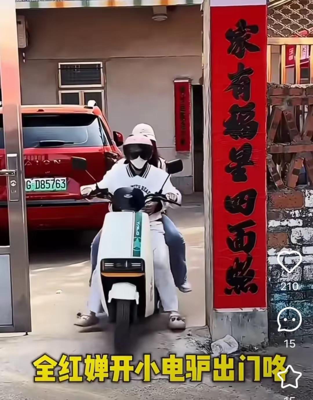 當然作爲土生土長的農村女孩,全紅嬋還是一如既往的接地氣。貼完春聯、就騎着她的小電驢出門了。