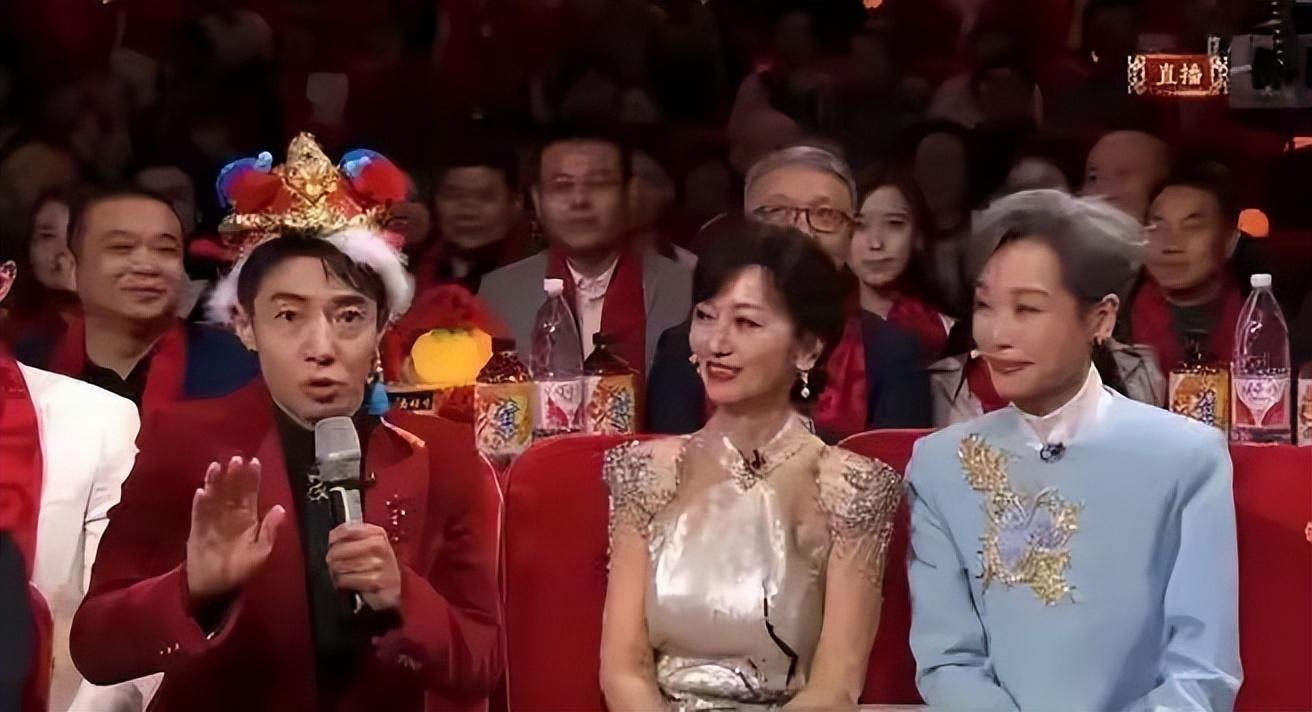 撒貝寧穿着紅色西服、戴着蛇娘生肖帽子,在兩位老藝術家面前,也是一臉的謙卑。他真的把姿態放得好低,一個勁的謝謝姐姐。