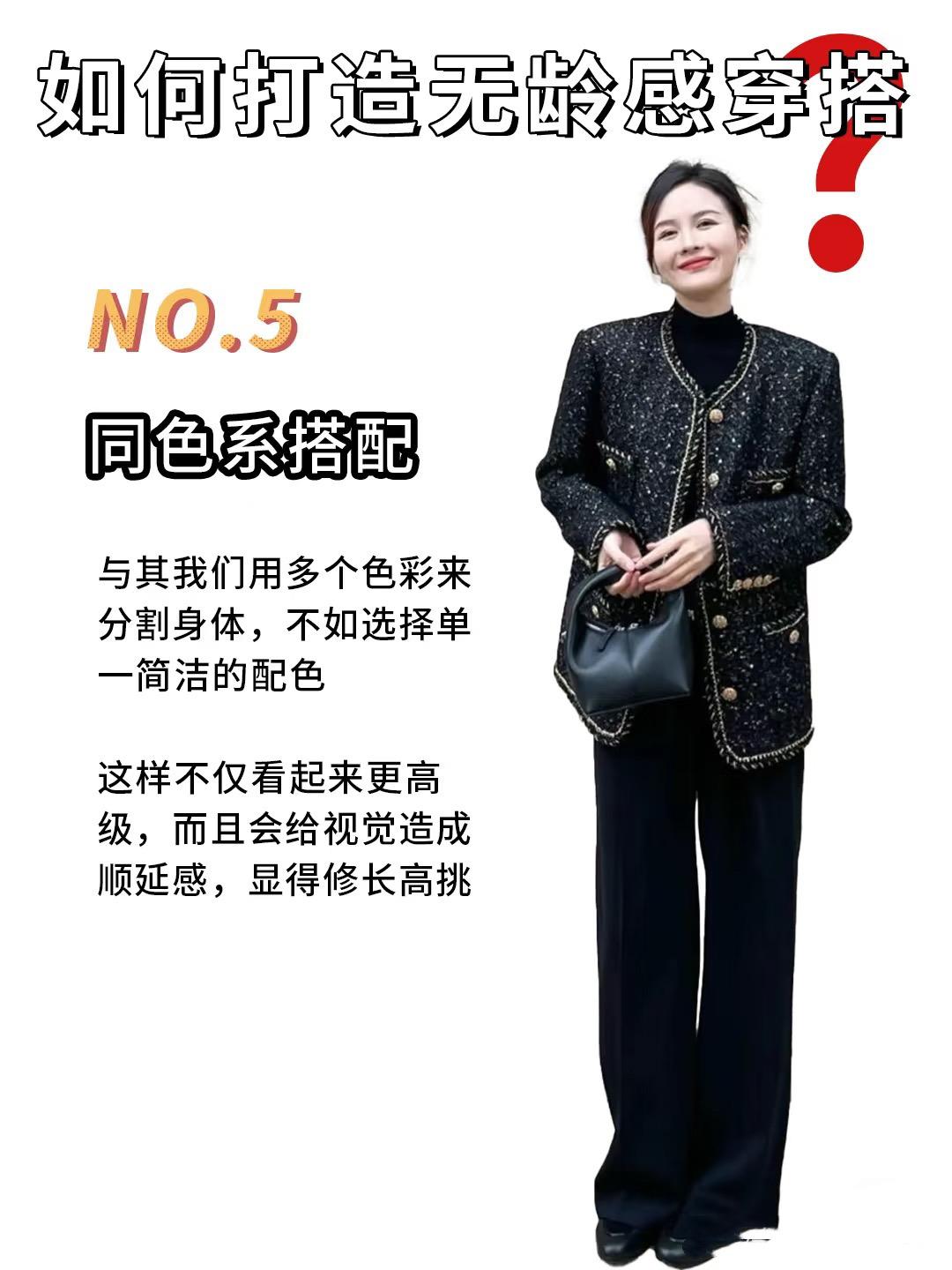 打造無齡感穿搭,還有一個重點,就是利用色系的延伸、打造出簡約又高級的美。比如黑色系的搭配,就會更加高級、顯得身材修長高挑。