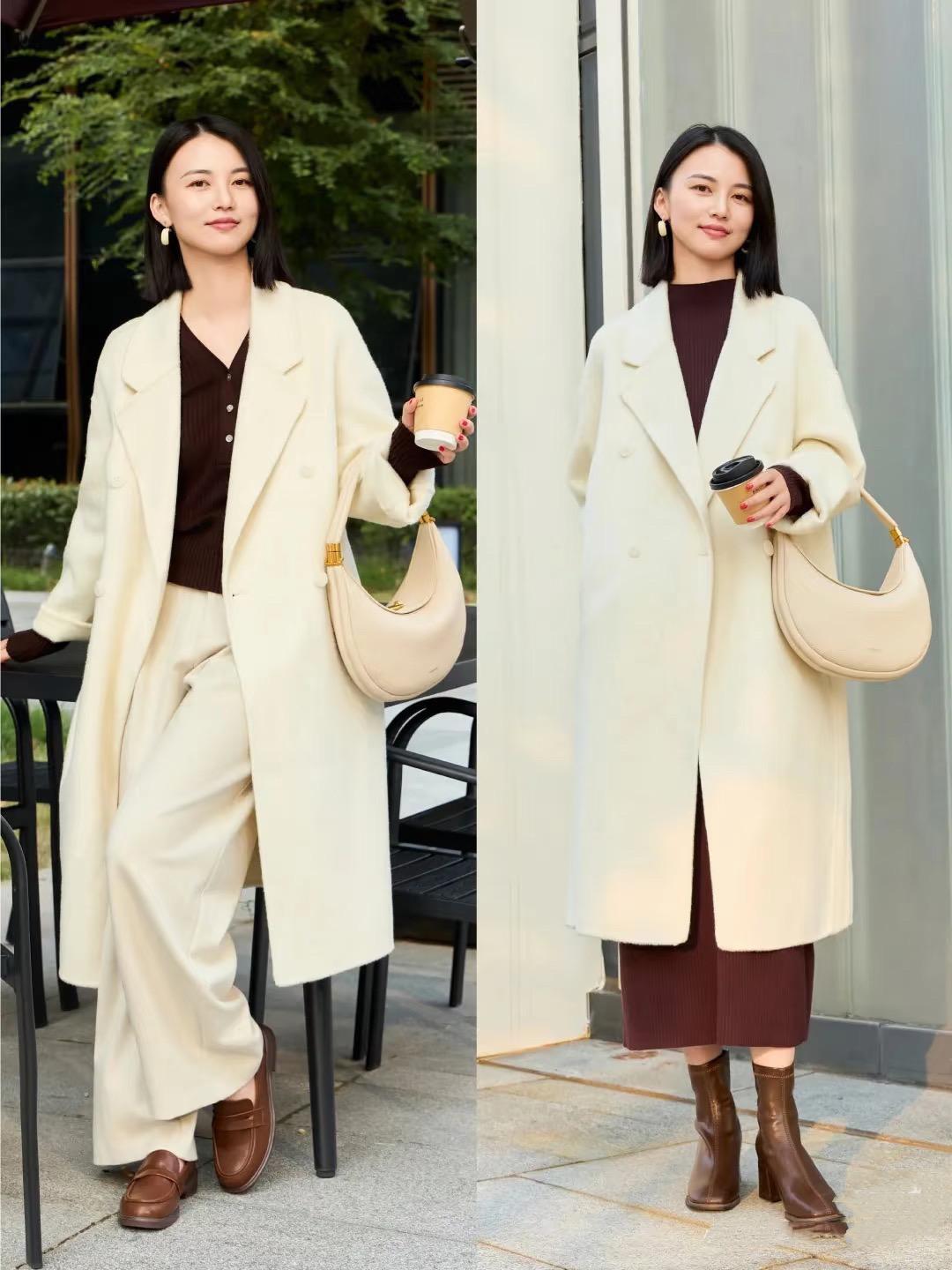 翻領大衣、與闊腿褲、針織裙都是很好的組合。這種高級感配色,真的是大方又顯氣質。白色翻領毛衣,配上棕色系大氣又溫柔。