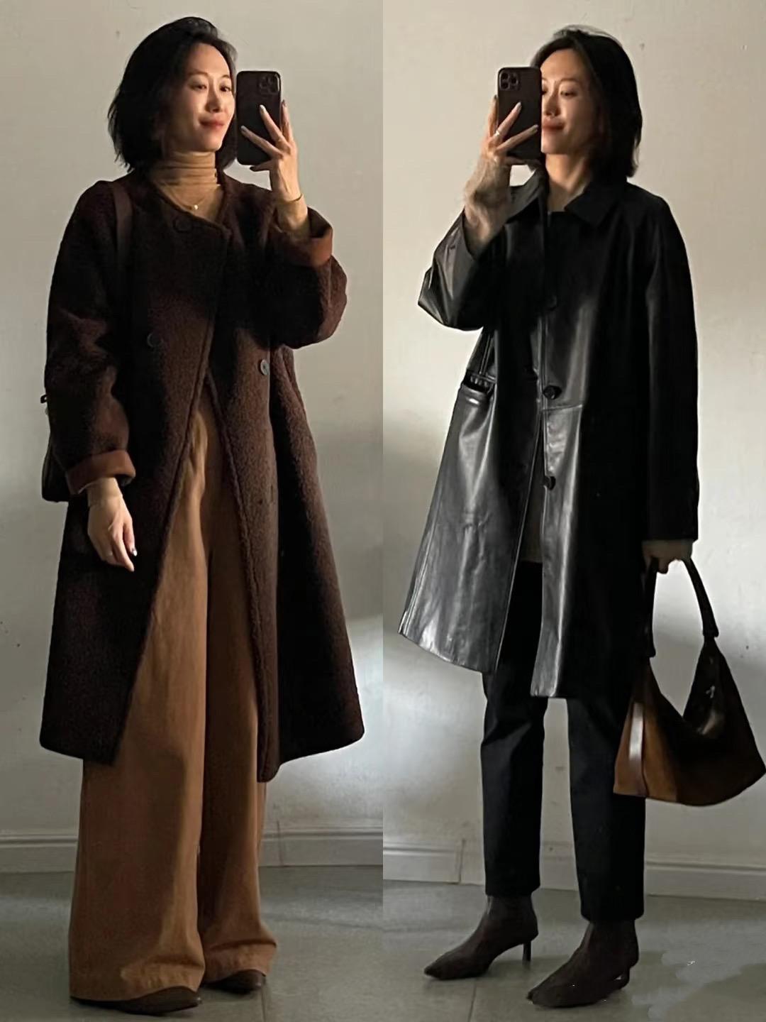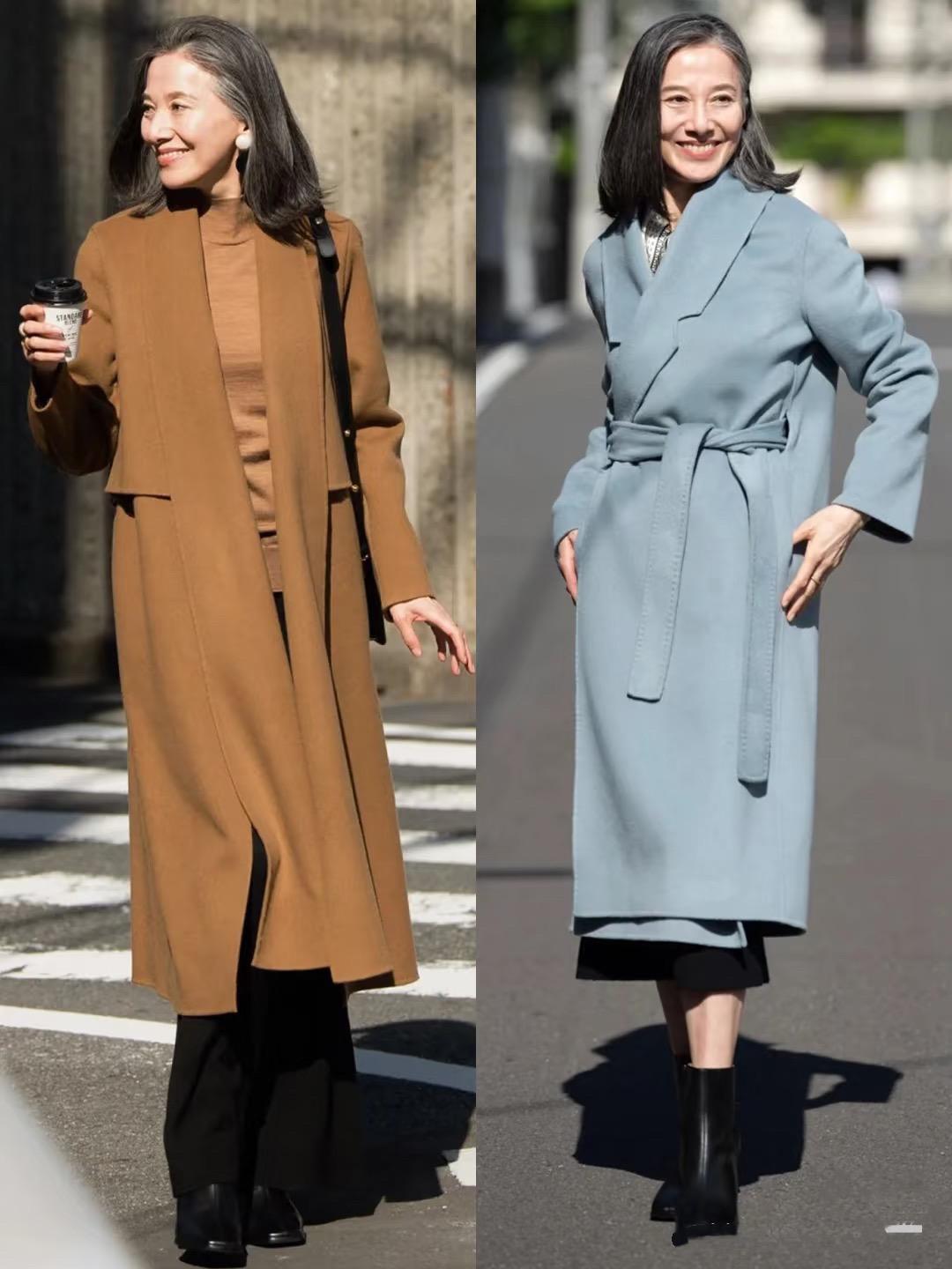 長款大衣+闊腿褲/半身裙的組合,一個大方利落、一個優雅嫺靜。這種黑色闊腿褲、可以配黑色高跟鞋,簡潔又顯腿長。