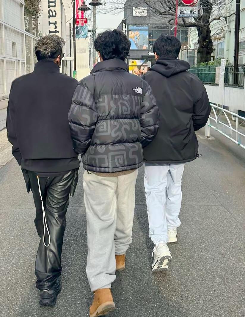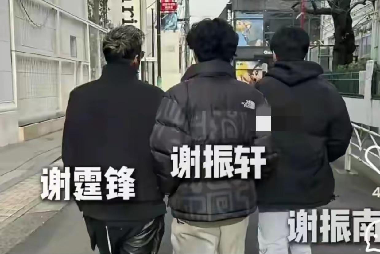 穿黑色外套、皮褲的就是帥氣的謝霆鋒,他的頭髮都白了、但身板依然好聽吧。謝振軒和謝震南都穿了黑色的羽絨服,更保暖一些。