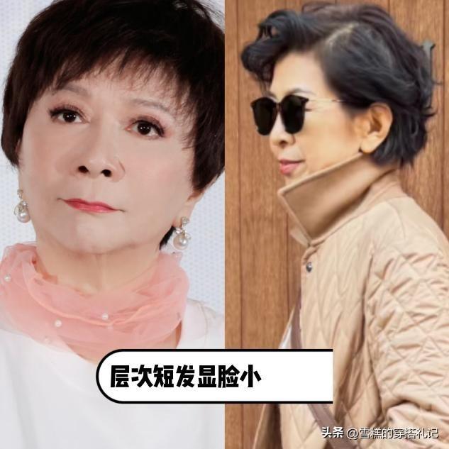 爲了保持頭部的輕盈與利落,大家可以多試試蓬鬆有層次的短髮,不需要過多的燙髮和染髮,只保留原有的弧度即可,從劉海到髮尾剪出長短不一的層次感,可以藉助短款髮型來修飾臉部的線條以及五官,像蔡明的這頭短髮剛好遮擋住太陽穴,填補了太陽穴凹陷的問題。