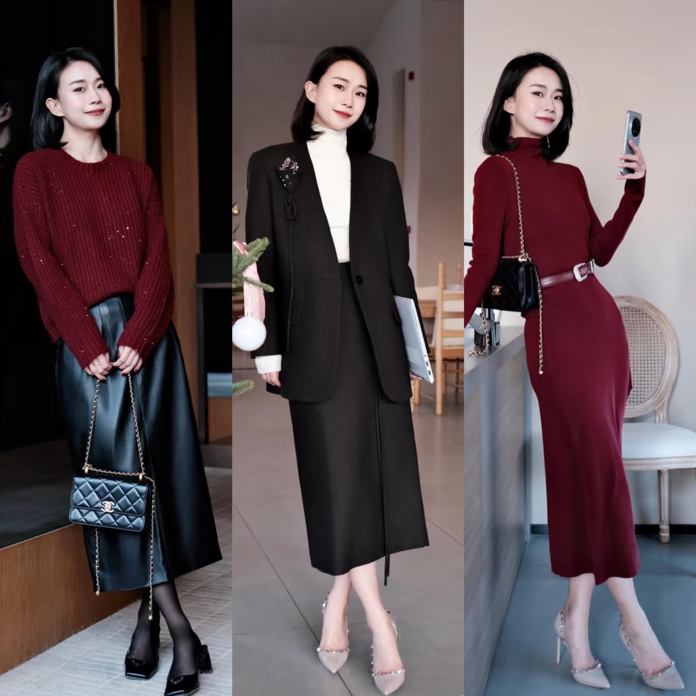 紅色國風毛衣配黑色半身裙,有一種經典且高級的美。黑色半身裙、儘量選擇挺括且高級的面料,打造出優雅又端莊的美。