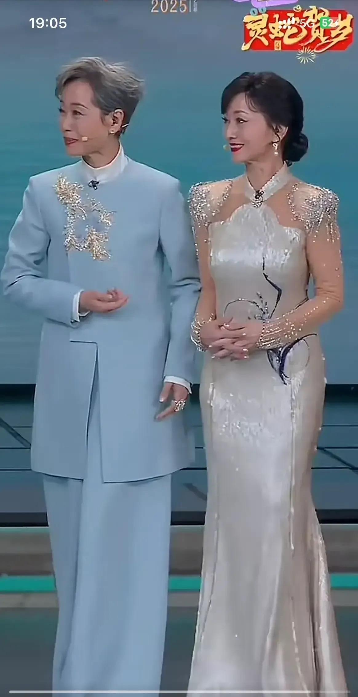 趙雅芝穿修身的旗袍裙,舉手投足都是優雅。葉童一身淺藍色的套裝,利落、帥氣、清爽,頭髮花白,也擋不住書卷氣。
