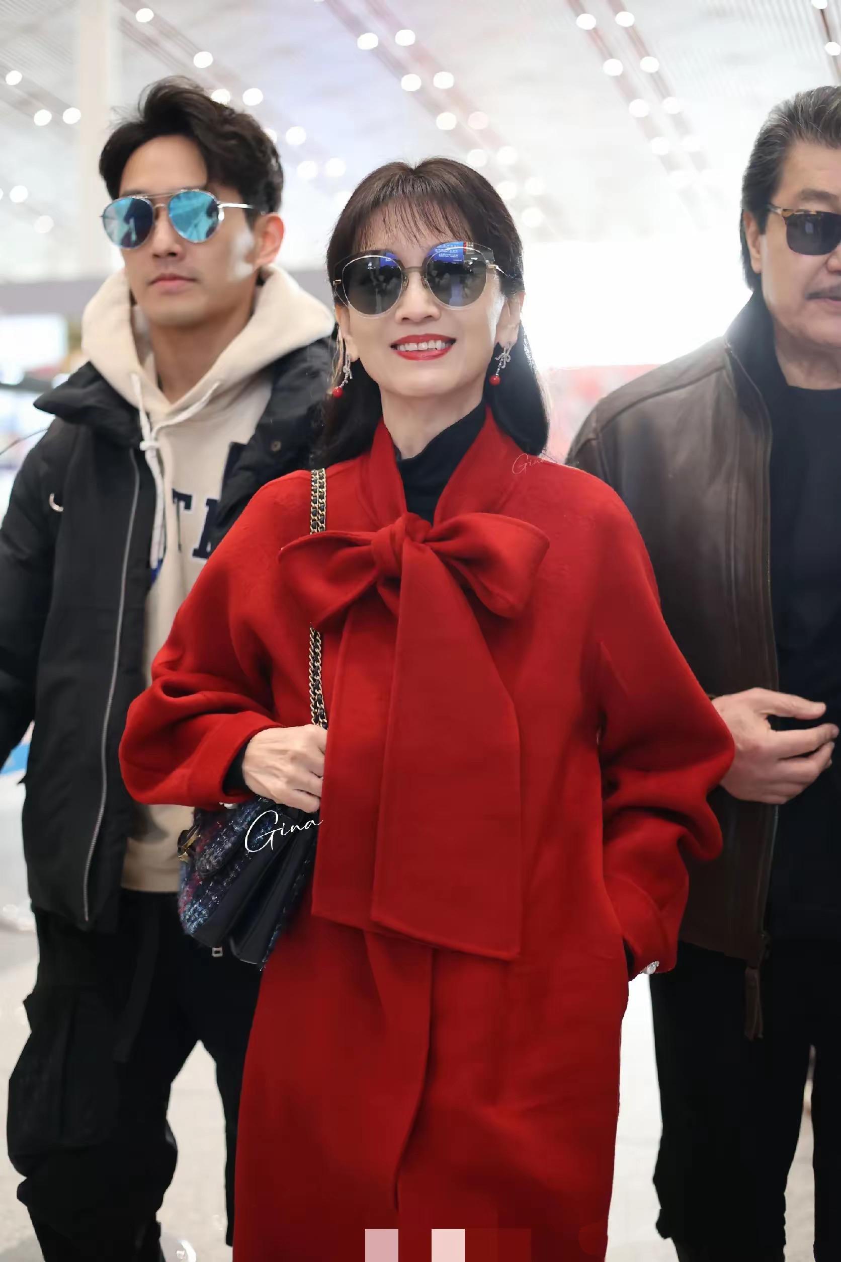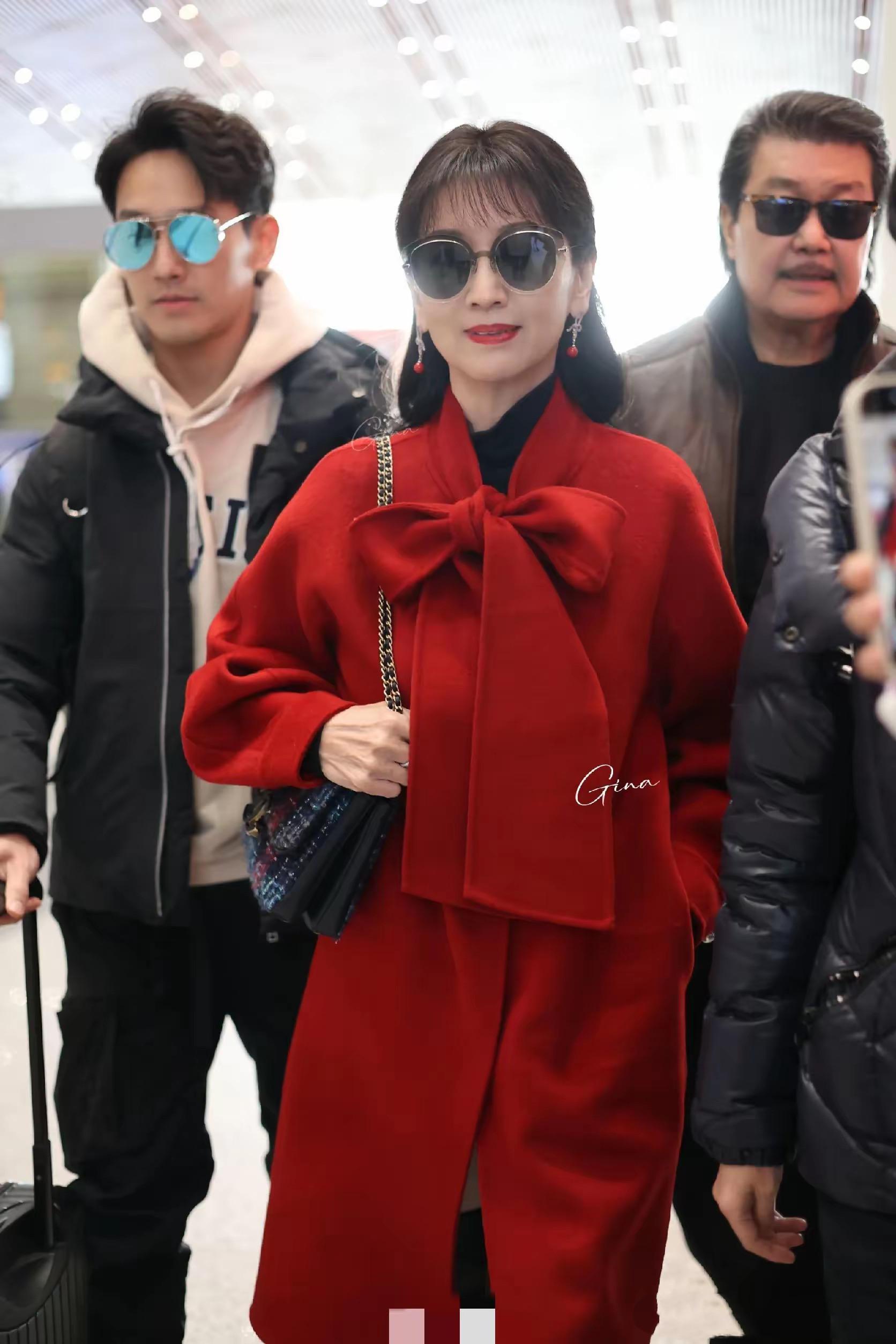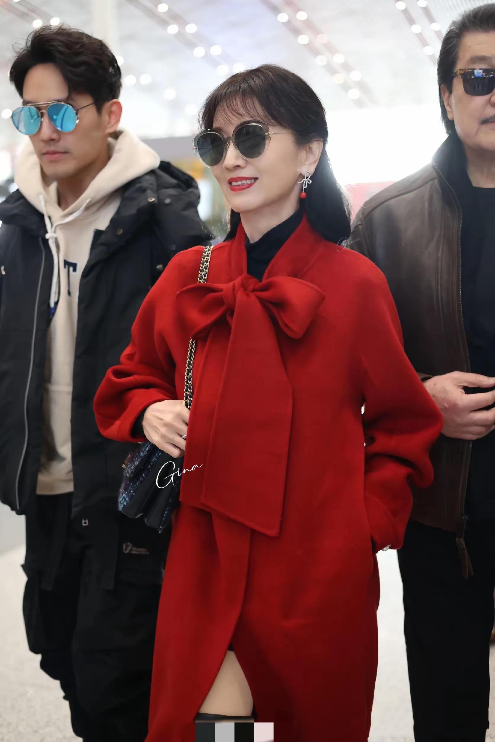 一家三口回香港,機場上的趙雅芝也是滿面春風。她穿了一件紅色大衣、配了黑色打底衫、長筒靴,又美又洋氣。