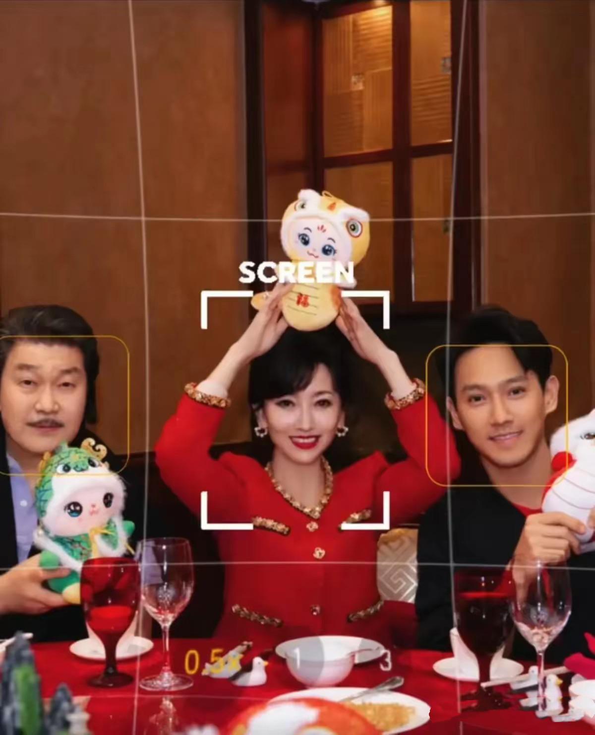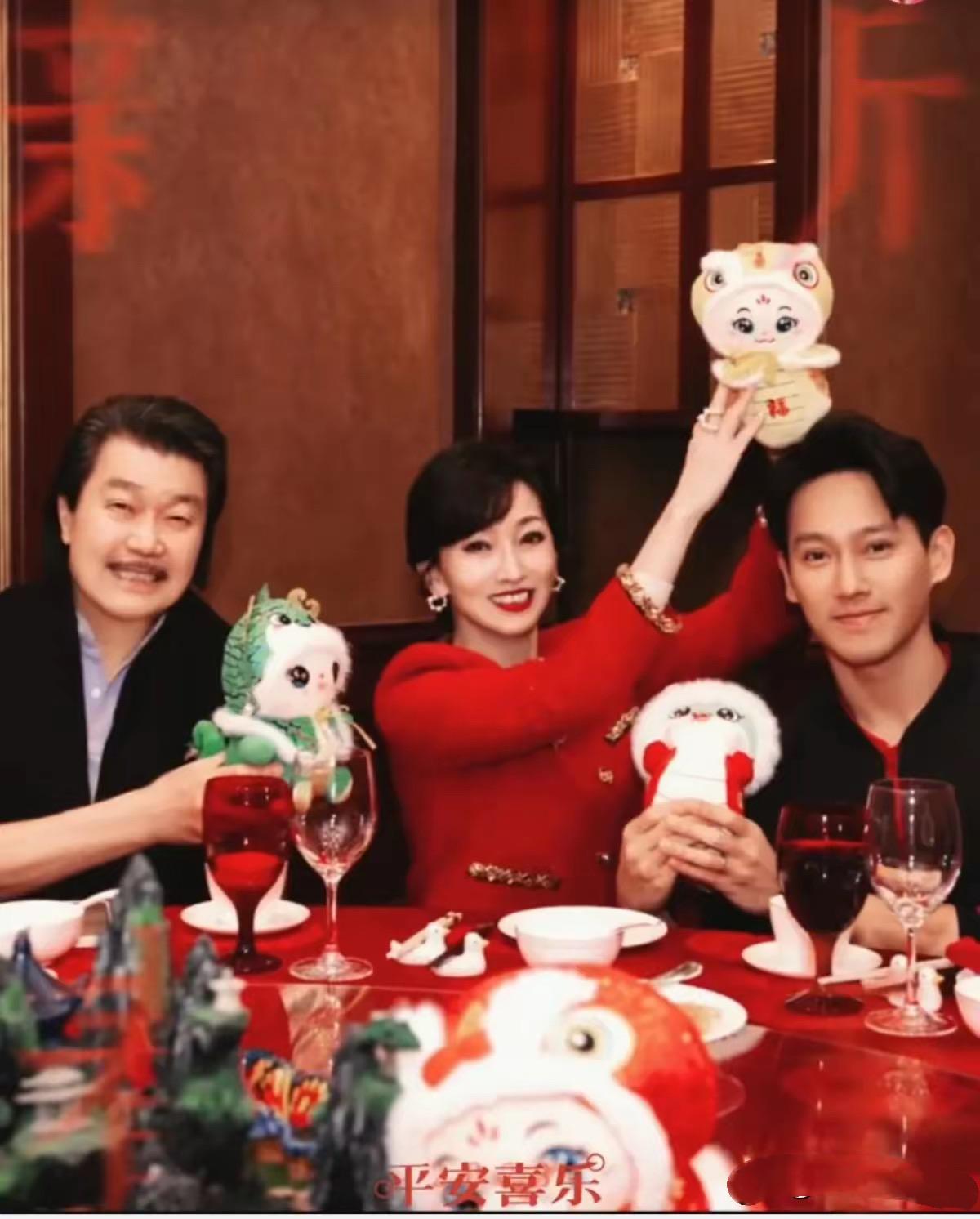 雖然是美顏精修的照片,但是照片的氛圍好溫暖、好喜慶。趙雅芝坐在中間,穿了紅色的小香風套裙,喜慶又精緻。