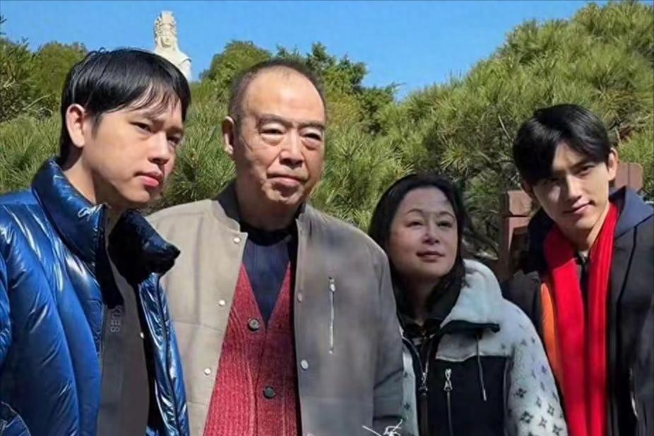 二兒子陳飛宇好帥氣,他長得有點像爸爸。穿一件黑色的棉服、繫了紅色圍巾,也是很喜慶。陳紅也沒有化妝,身材有點發福、看起來更富態了。