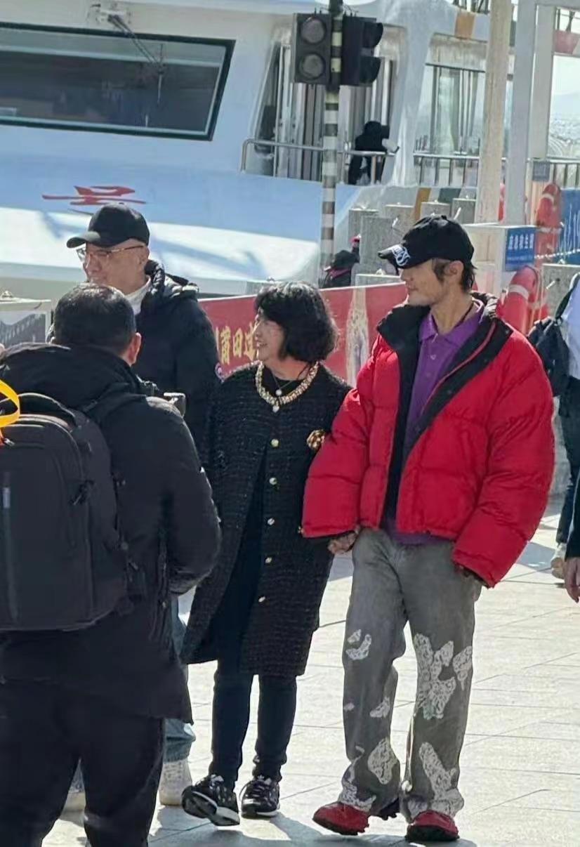 黃曉明牽着媽媽的手,也是很溫馨的一幕。黃曉明在娛樂圈也是出了名的孝順,黃媽媽穿了一件小香風的大衣,配了緊身的小黑褲、老爹鞋,休閒又精緻。