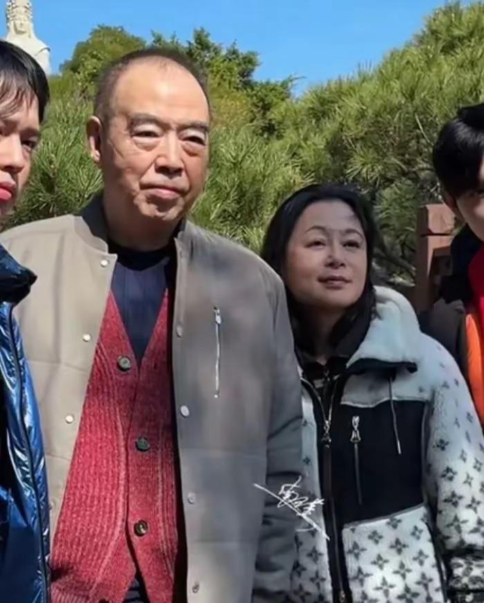 陳凱歌一家,真是非常樸素又接地氣。陳凱歌穿了一件夾克風外套、內搭酒紅色的針織衫、最裏面是藏藍色的打底衫。這種三明治疊穿,倒不會顯得邋遢。