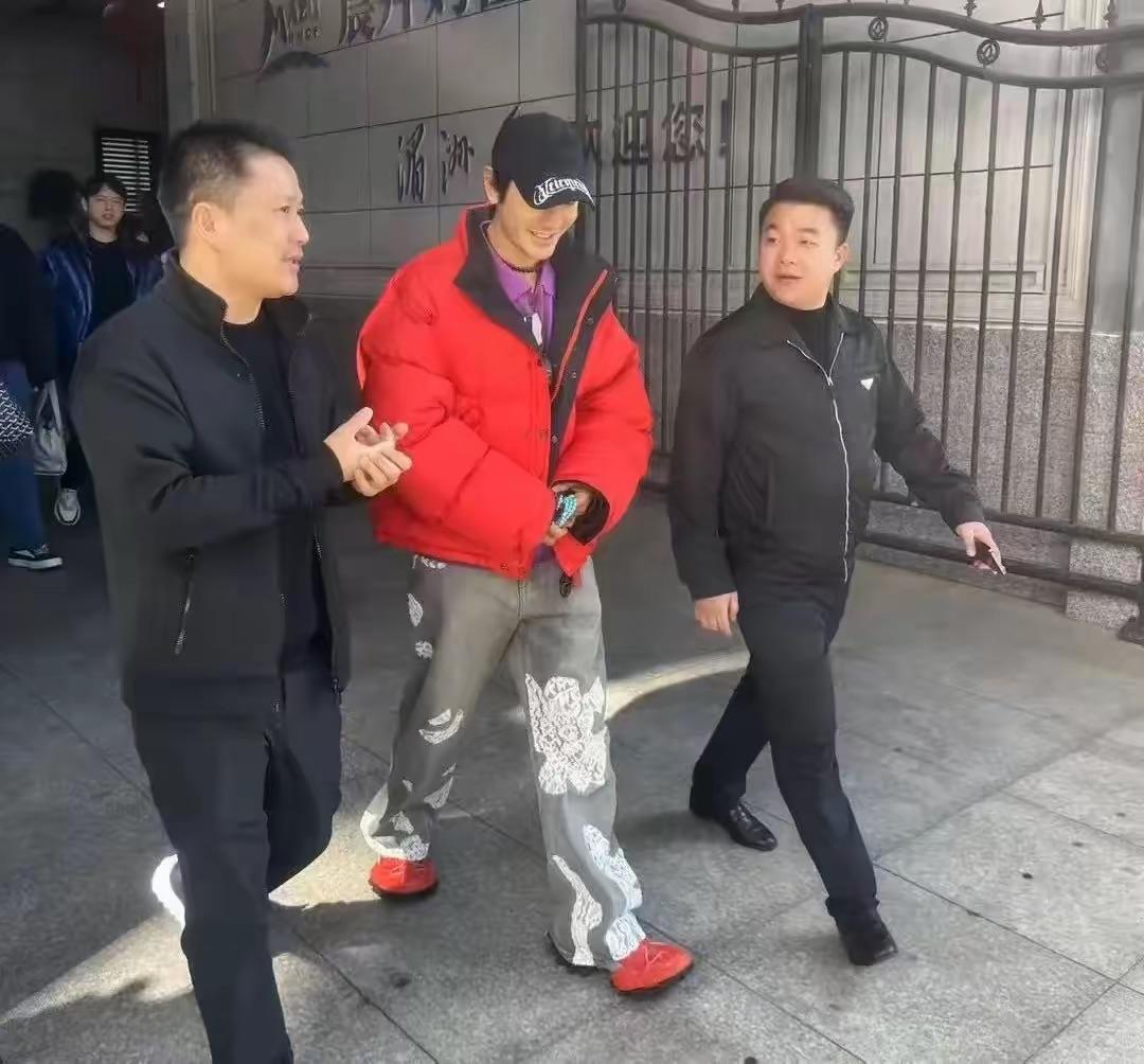 紅色的麪包服、刺繡修飾的灰色闊腿褲、紅色的運動鞋,他還戴了鴨舌帽,真實又潮又酷。陪在黃曉明身旁的是他的媽媽,並沒有看到葉珂的影子。