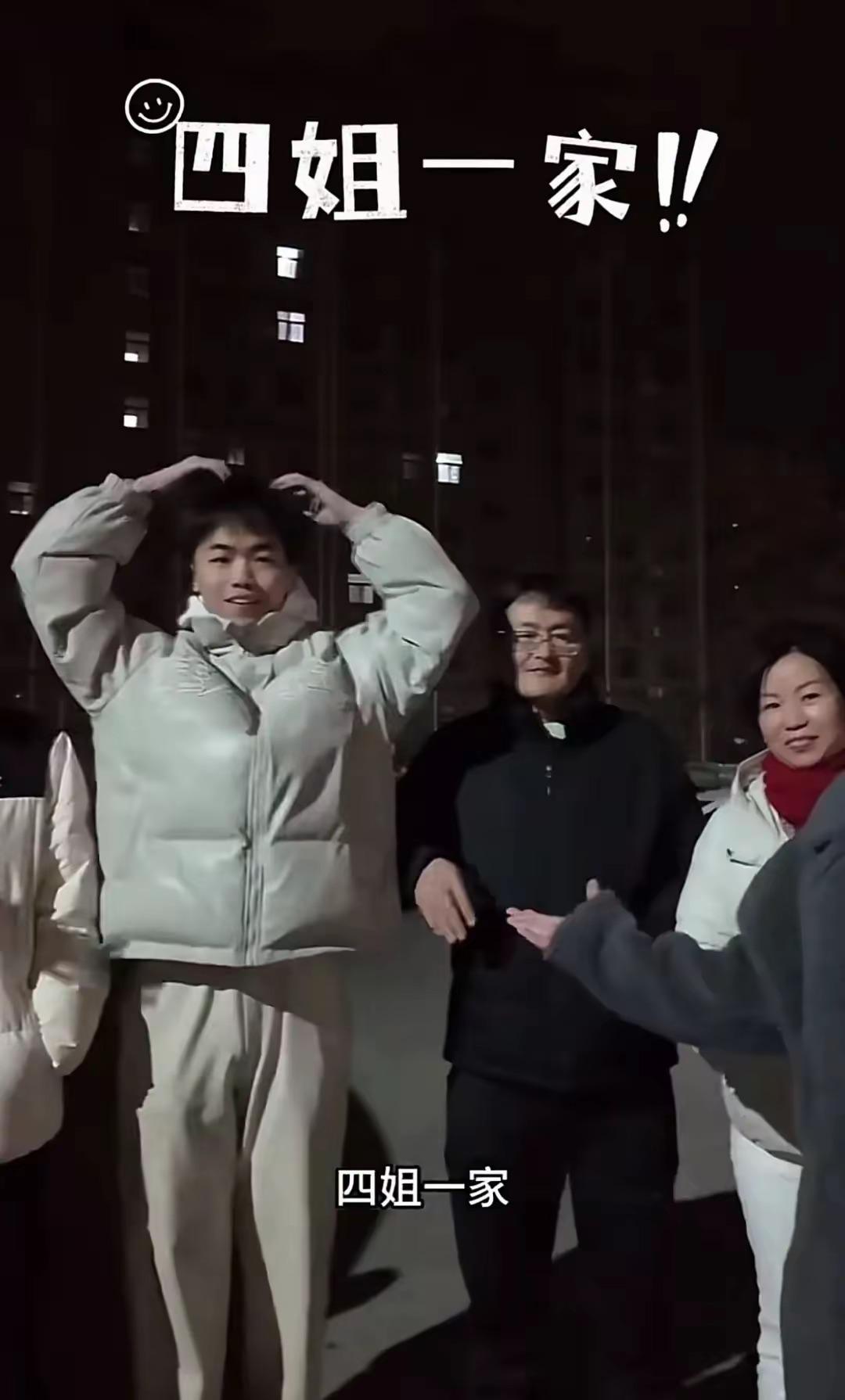 四姐一家,他們一家人打扮的好洋氣、有點文鄒鄒的。這大外甥也長的清秀帥氣、穿白色羽絨服、闊脫褲,乾淨又耐看。