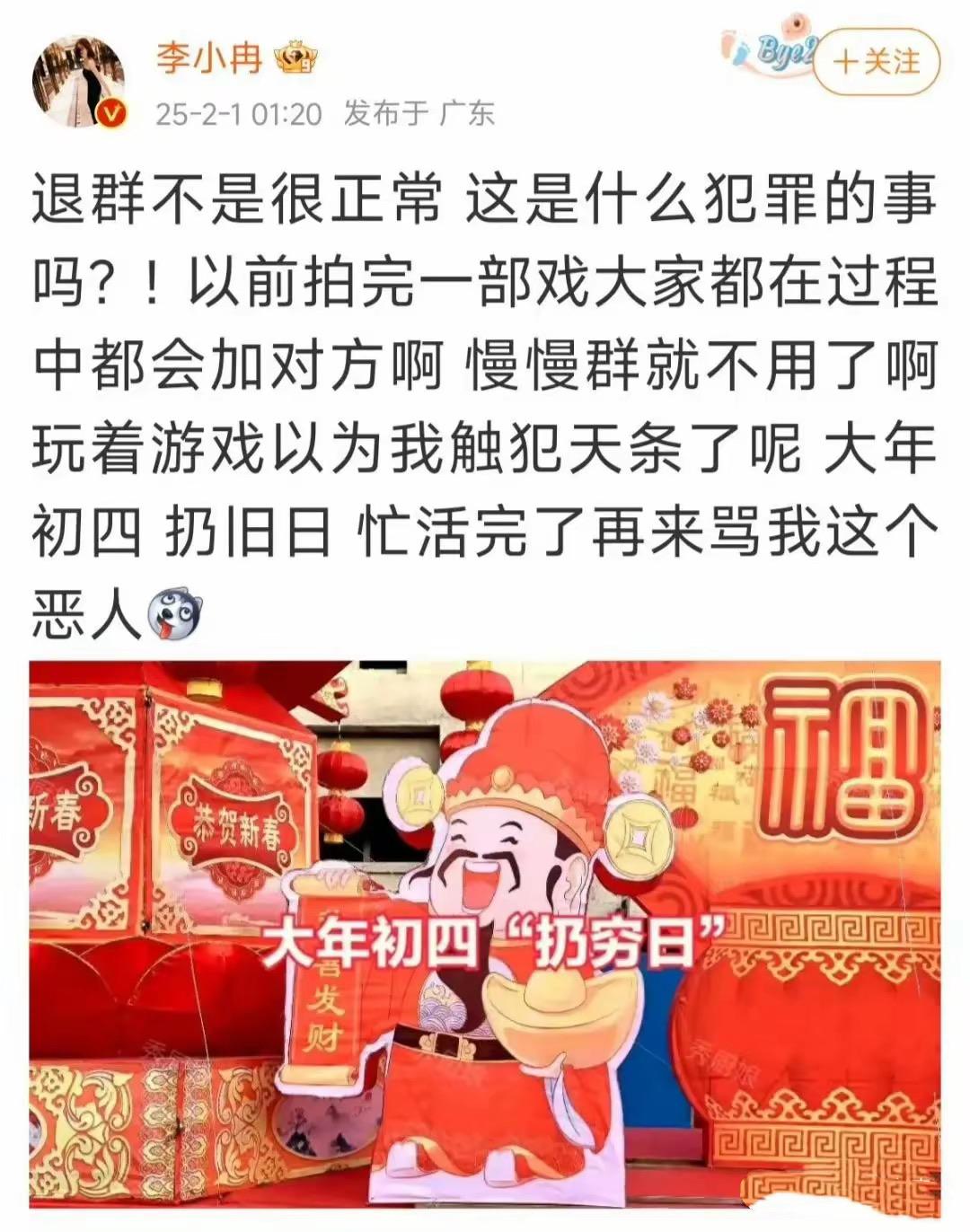深夜怒懟網友:退羣不是很正常,這是什麼犯罪的事嗎?以前拍完一部戲大家都在過程中加對方,慢慢羣就不用了啊。其實退羣本是一件小事、沒必要因爲這件事大動干戈。