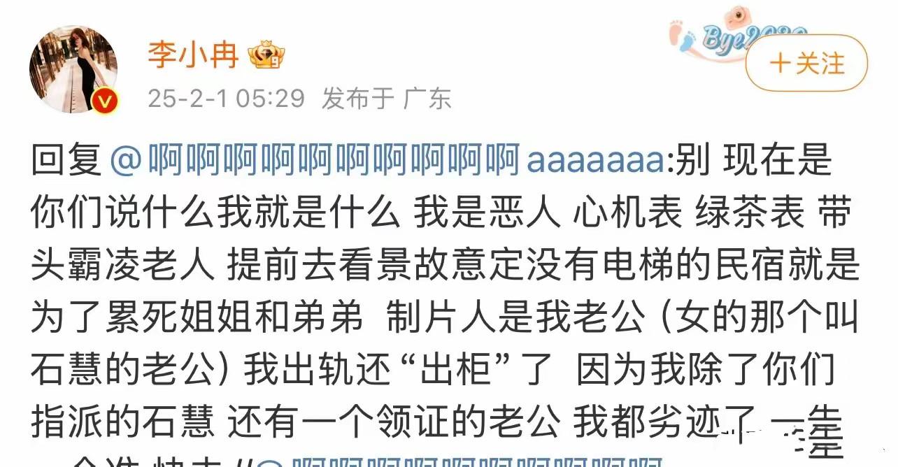 不僅如此,李小冉還特別直白的否認了老公是製片人的傳言。她說製片人是我老公(女的那個叫石慧的老公),我出軌還“出櫃”了。這麼明目張膽的和網友硬剛、李小冉真是勇氣可嘉。