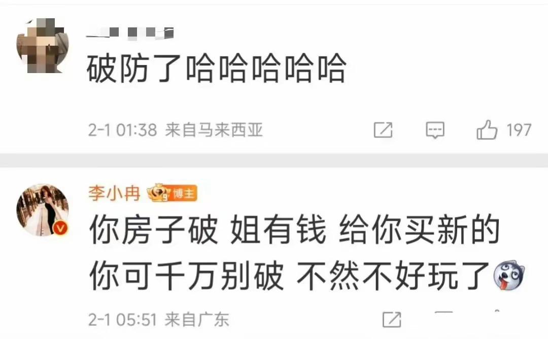 帶着幾分戲虐,有網友說破防了,李小冉回覆你房子破、姐有錢,給你買新的。哈哈哈,姐能不能給我也買套新的呀!我房子破。
