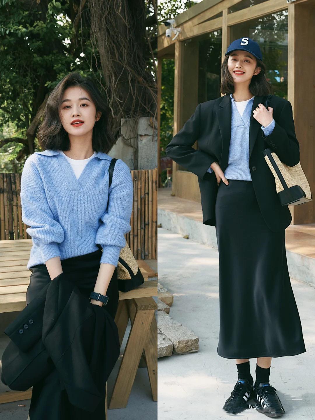 一件淺藍色的V領針織衫,自帶溫柔感、也甜美減齡。這種藍色V領針織衫+白色T恤的組合,可以更時尚、更耐看,層次也足夠清晰。