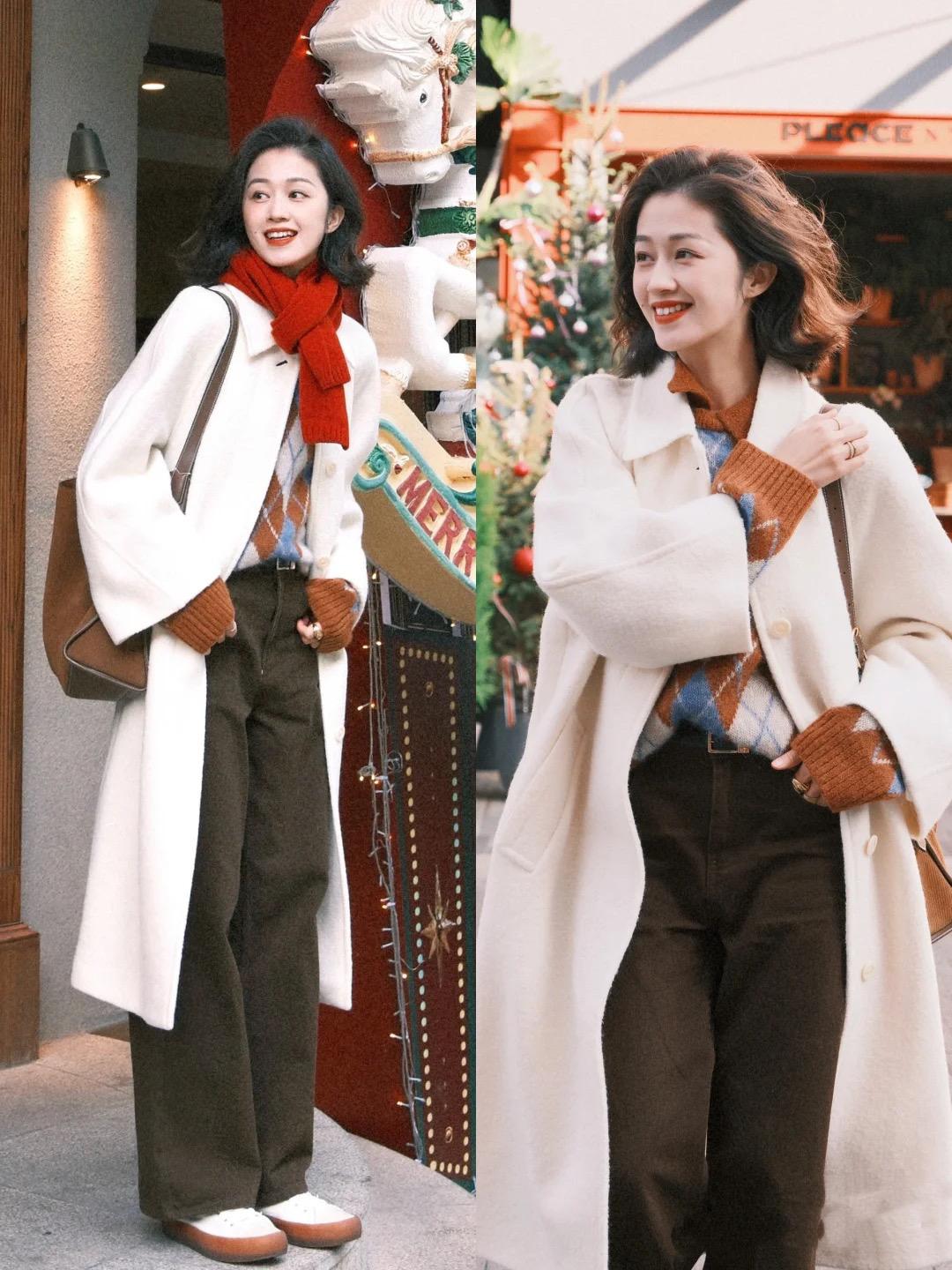 白色長大衣,配上紅色圍巾也很有氛圍感。尤其是高腰的直筒褲、簡單大氣又顯腿長。棕色直筒褲比較復古,有腔調、也很耐看。