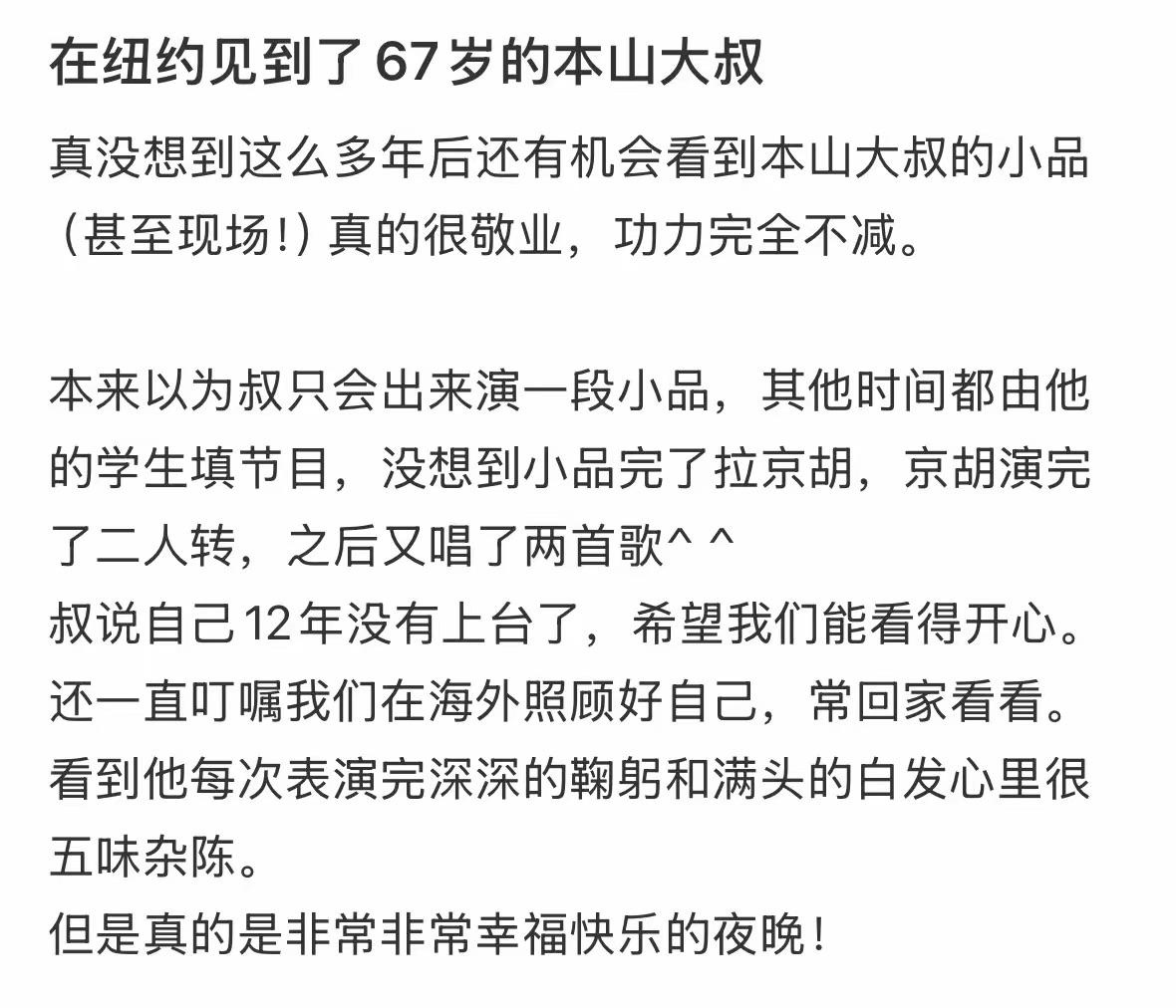 在這一場紐約演出裏,本山大樹真的是很敬業。網友以爲只能看到一段趙本山的小品,沒想到她還拉了京胡、演了二人轉、唱了兩首歌。一直忙活了3個多小時,真實太震撼了。