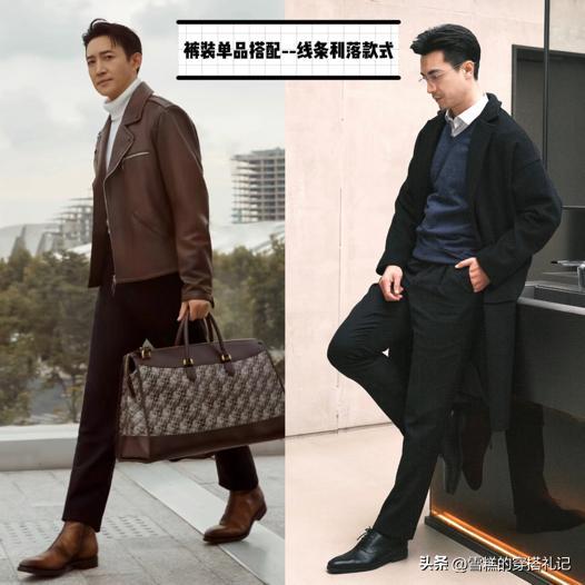 對於男性而言選對一款褲裝是非常至關重要的,在這裏推薦給各位優選項西裝褲以及直筒系列的一些利落型的褲裝進行搭配。而且色系最好能夠運用像黑色灰色以及飽和度較低一些的顏色,穿起來的時候營造出來的輪廓感更加的流暢和諧,對於我們腿型的優化力也很足。