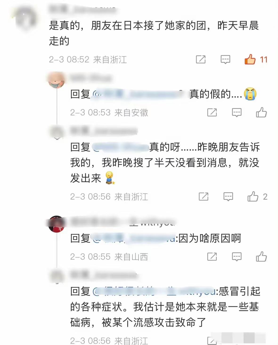 如果不是真的,應該會第一時間闢謠吧。畢竟大過年的、被傳過世也不那麼吉利。但是她的家人並沒有出來闢謠,就讓人更確信了。