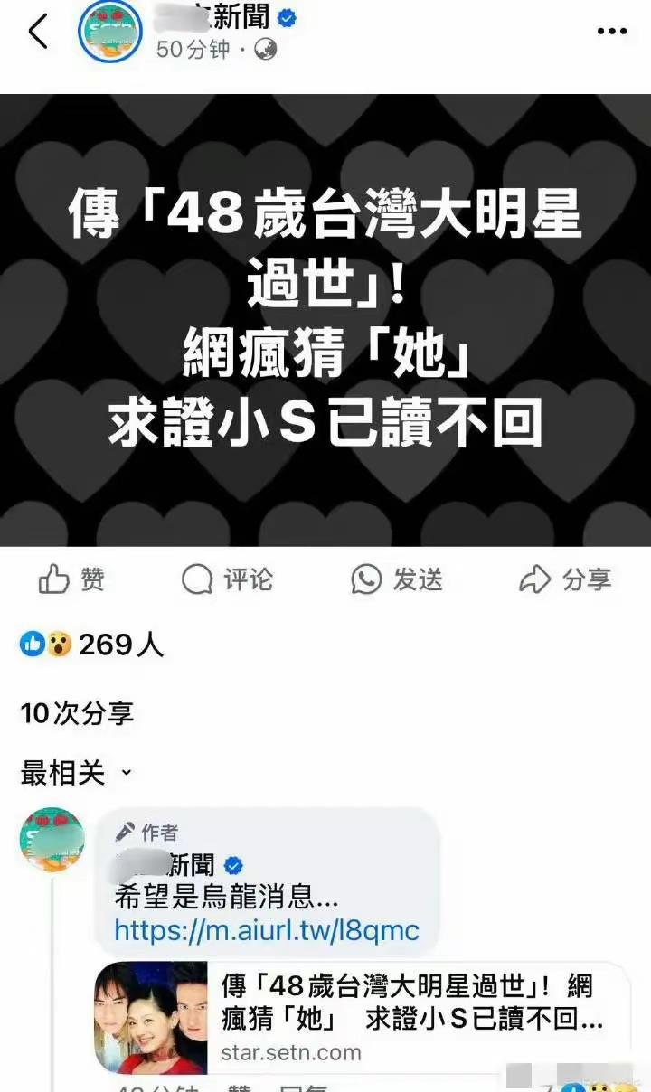 先是臺北報道“臺灣有位大明星過世”,並且透露了對方48歲已婚、有小孩、《流星花園》出道等等,不少網友就對標大S,並且像其妹妹小S求證。小S的消息狀態是已讀未回,更明確了大家的猜測。