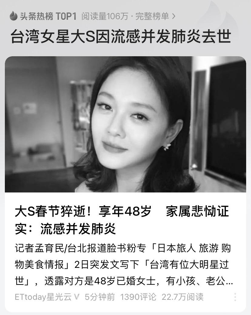 太不可思議了,48歲的大S怎麼就突然離世了。看報道稱是在日本旅遊、得了流感,因爲救治不及時、引發了肺炎等併發症,已經離世了。