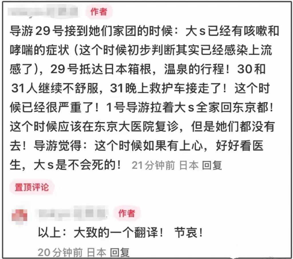 有導遊表示,大S去世、與她們家人沒有上心也有關係。如果好好看醫生、大S是不會死的。