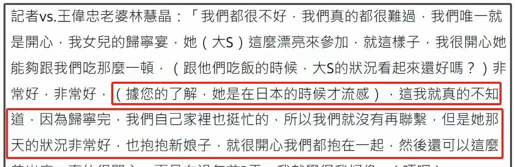 在林慧晶的言語裏,我們瞭解到當時大S的狀態非常好、她應該是在日本的時候才流感。但是林慧晶表示自己真的不知道,因爲貴經驗後我們也很忙、沒有再聯繫,但是那一天她狀態很好,很漂亮。