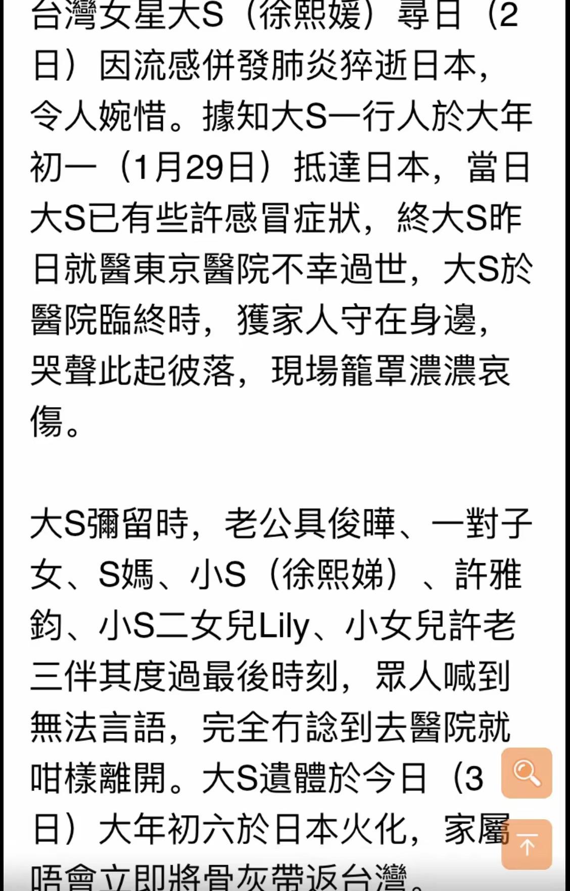天有不測風雲、人有旦夕禍福,大S突然間就走了,她的家人哭到不能言語。她的遺體將於大年初六在東京火化,願天堂再無病痛!