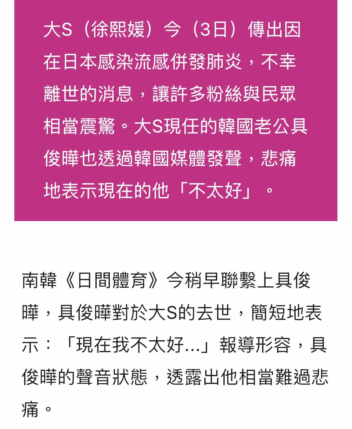 2月3日,剛剛傳出大S在日本感染流感病發肺炎離世的消息,許多粉絲也是相當震驚。大S的現任老公也發文表示“他現在不太好”。