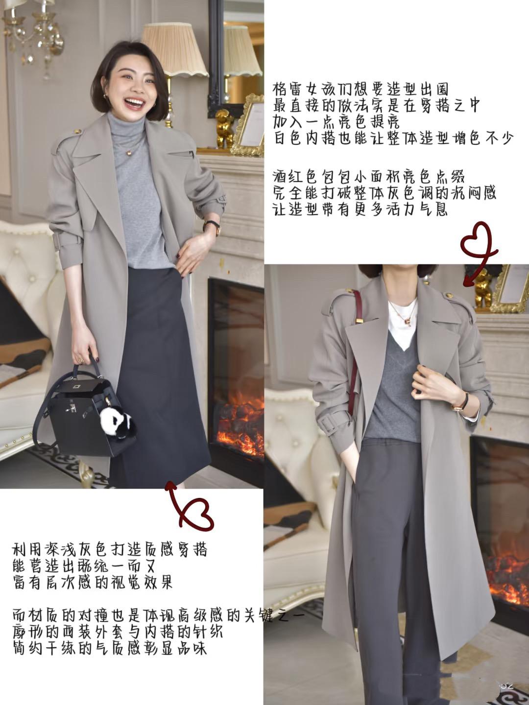 喜歡格雷系的穿搭,就用灰色風衣配同色系的半高領打底衫,這樣的穿搭幹練又顯氣質,想要提升春日氛圍,可以增加一點明亮色、或者小配飾點綴。