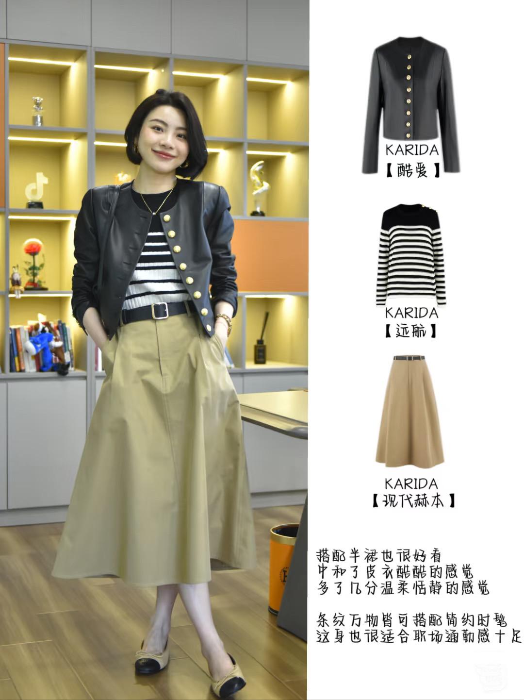春天裏的皮衣外套,其實搭配好了也可以掩蓋腰粗、胯寬的問題。如果你下半身比例沒有那麼勻稱,建議大家嘗試這種高腰的傘裙。