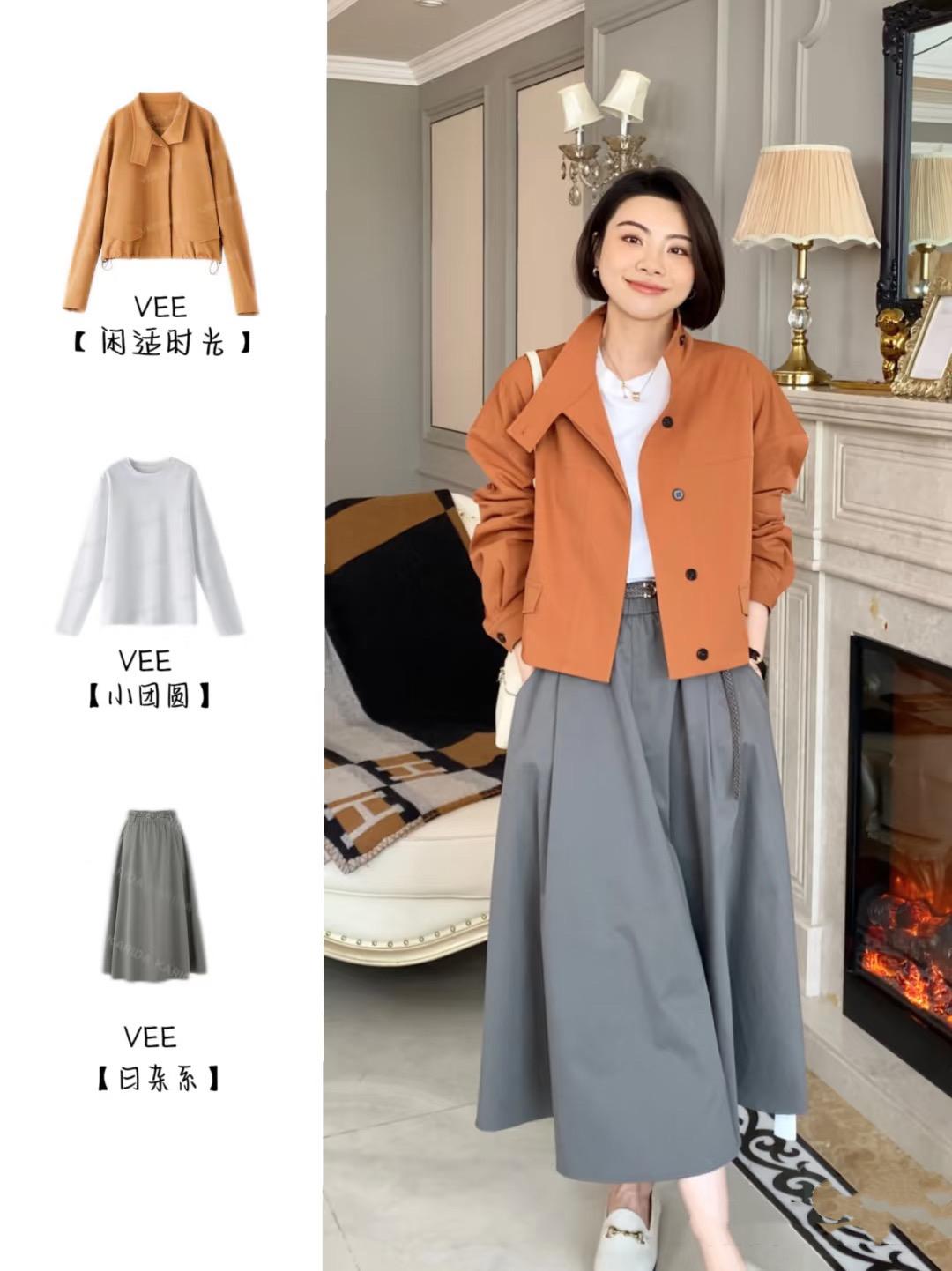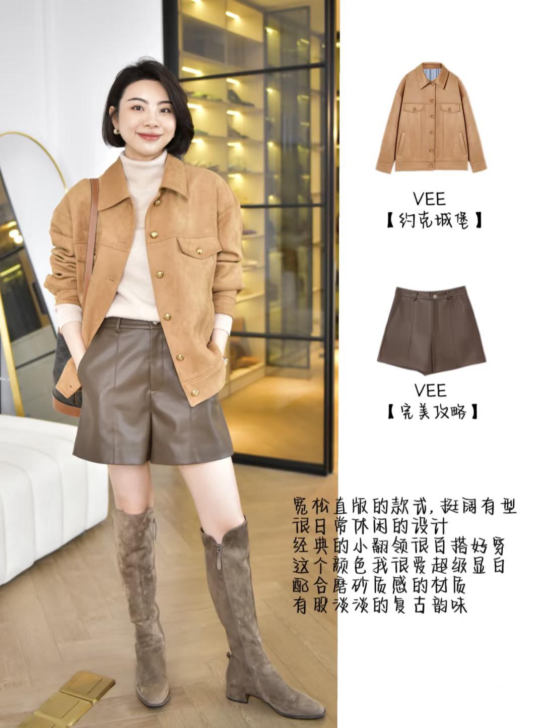 卡其色麂皮絨外套,可以配短褲、也可以配直筒褲、闊腿褲。直筒牛仔褲、可以嘗試搭配修身的九分褲款式,更加大方修飾腿型。