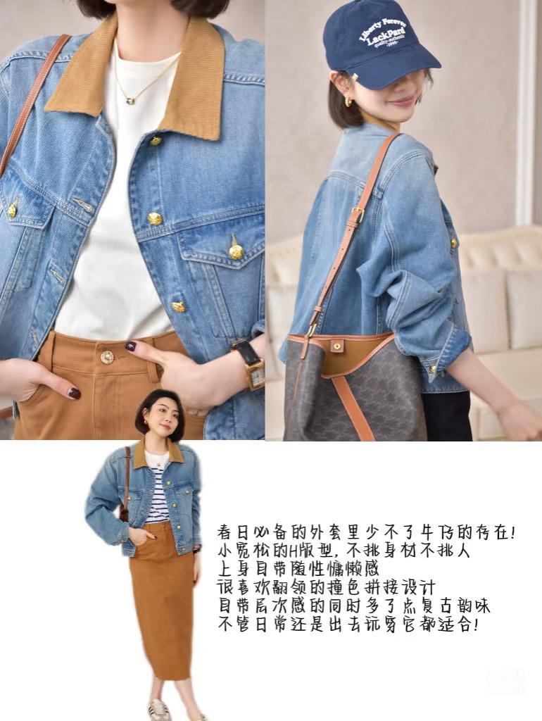 藍色牛仔外套,也可以選擇帶有風格設計感的款式。比如撞色的棕色領口,增強了視覺衝擊力,讓我們的穿搭更有辨識度。