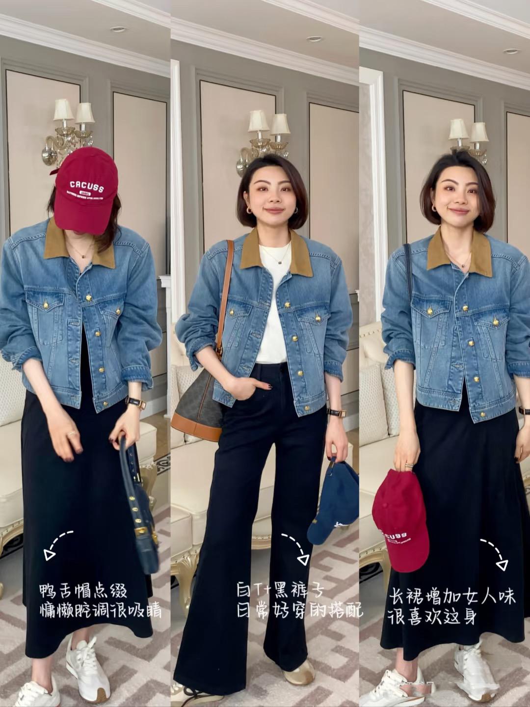帶着春季氛圍的穿搭,誰能不喜歡呢?簡單休閒的牛仔外套,我們可以嘗試配黑色半身裙、或者微喇褲來穿。