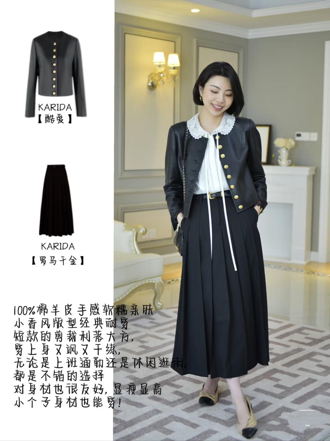 這種黑色皮衣外套,疊搭白色襯衫,有一種很溫和很減齡的效果。黑色皮衣外套,配同色系的百褶半身裙,優雅又顯氣質。