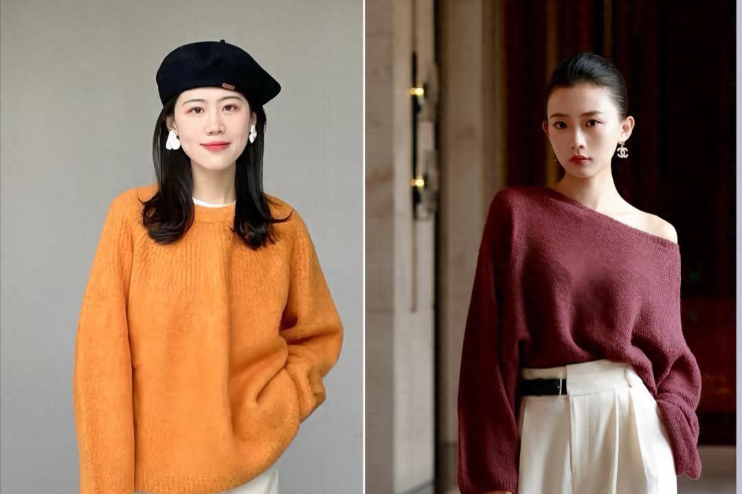 上深下淺,其實就是選擇高飽和度的毛衣、搭配淺色系的下裝。比如寬鬆橘色毛衣、或者棕色毛衣,都可以配色彩柔和的白褲子。