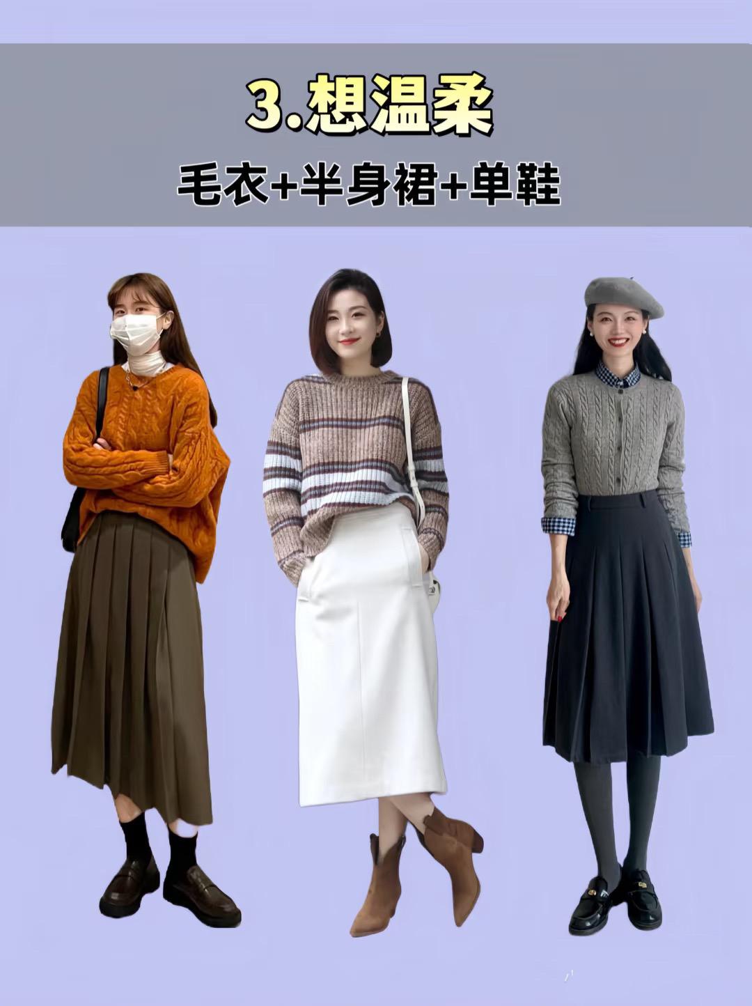 一組很溫柔、也相對減齡的打扮,寬鬆的毛衣、或者復古的毛衣,都可以用來配半身裙。打造出學院風的情懷,格外的溫婉低調。