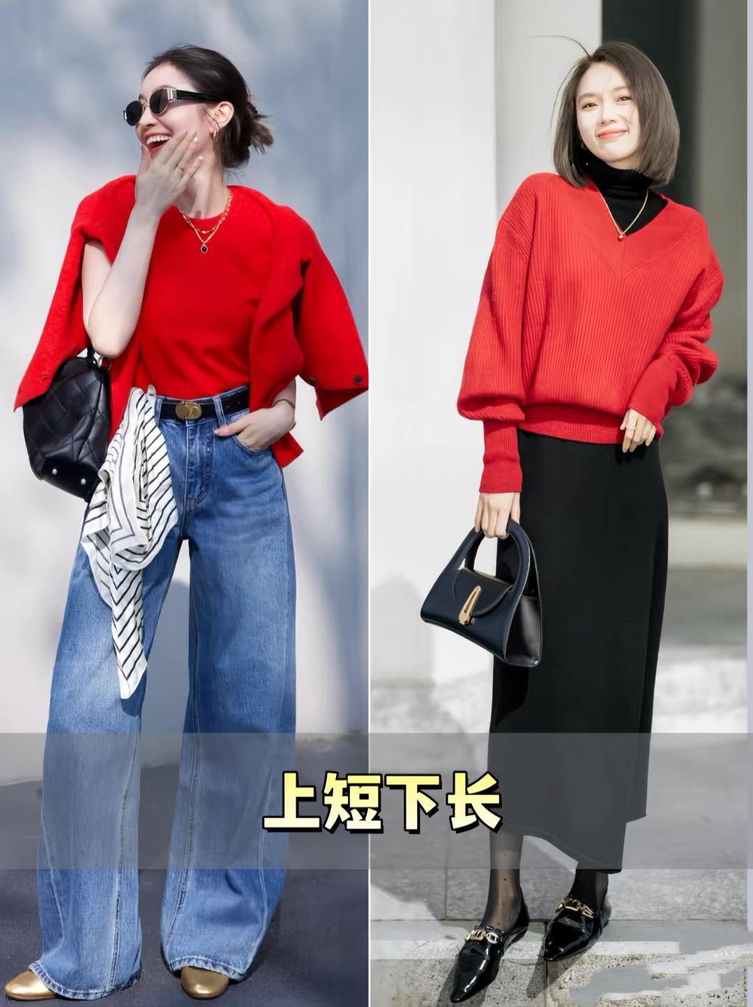 讓簡潔高級的穿搭,瞬間變得更加時髦出彩。比如紅色毛衣,可以配高腰的牛仔長褲、H型的過膝長裙,優化比例更顯腿長。