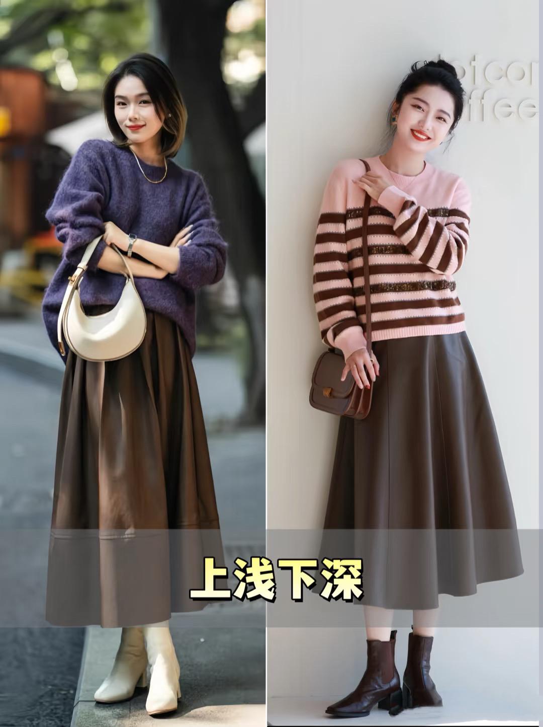 比如棕色或者深卡其色的傘裙,優雅大方又帶着從容之美。寬鬆的毛衣,直接配高腰的傘裙,給人一種很高級大氣的端莊美。