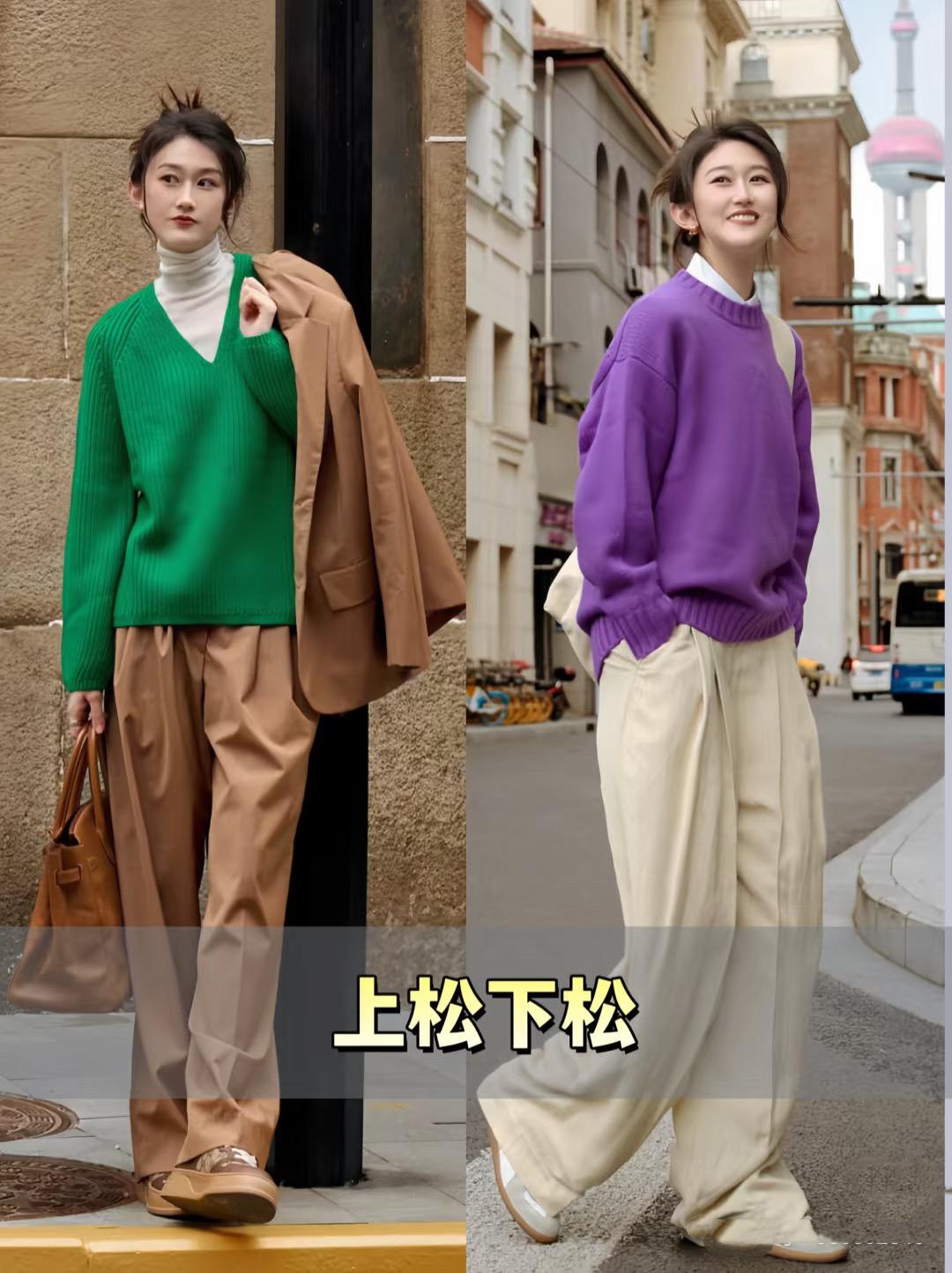 上松下松,是指我們的毛衣或者褲子,都可以選擇相對寬鬆的版型,形成一種上松下松的效果,鬆弛慵懶、更加時髦隨性。