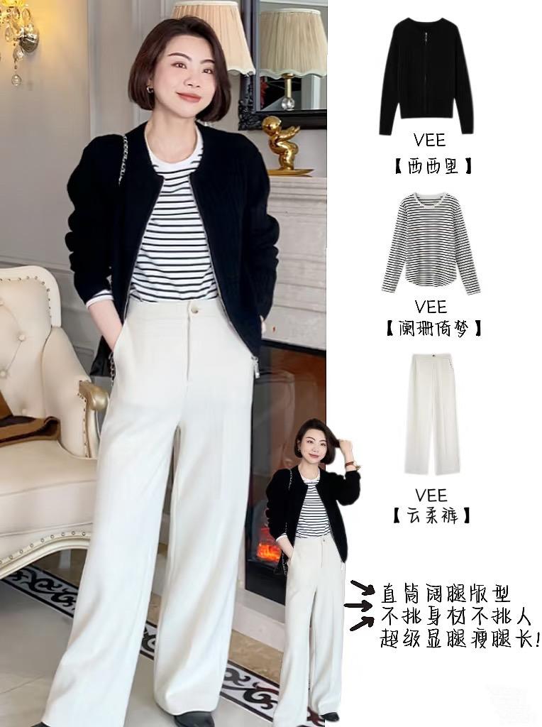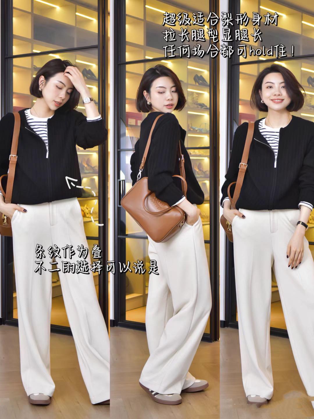 白色闊腿褲可以配黑色的半拉鍊毛衣,內搭黑白條紋T恤,層次清晰又時髦養眼。這種白色闊腿褲,配上厚底的德訓鞋,也舒適自由。
