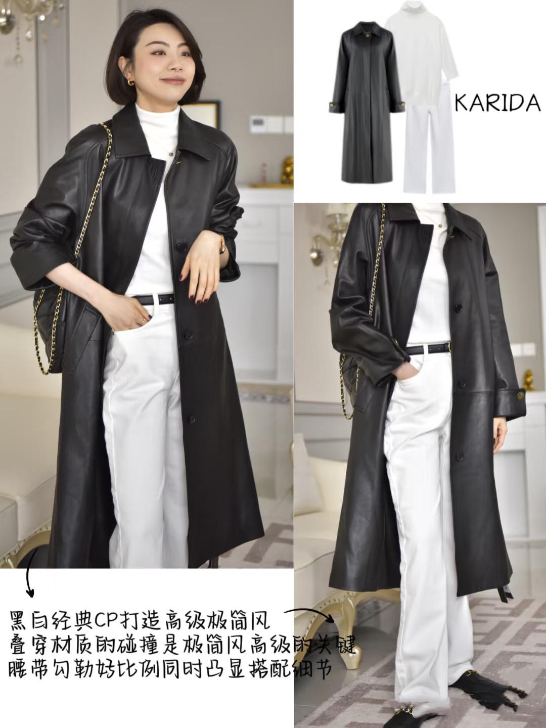 很經典的黑白配,打造出一種高級颯美。春天裏的穿搭、也可以如此的簡單幹淨。長款的黑色皮衣,疊搭白色半高領打底衫,不臃腫更利落。