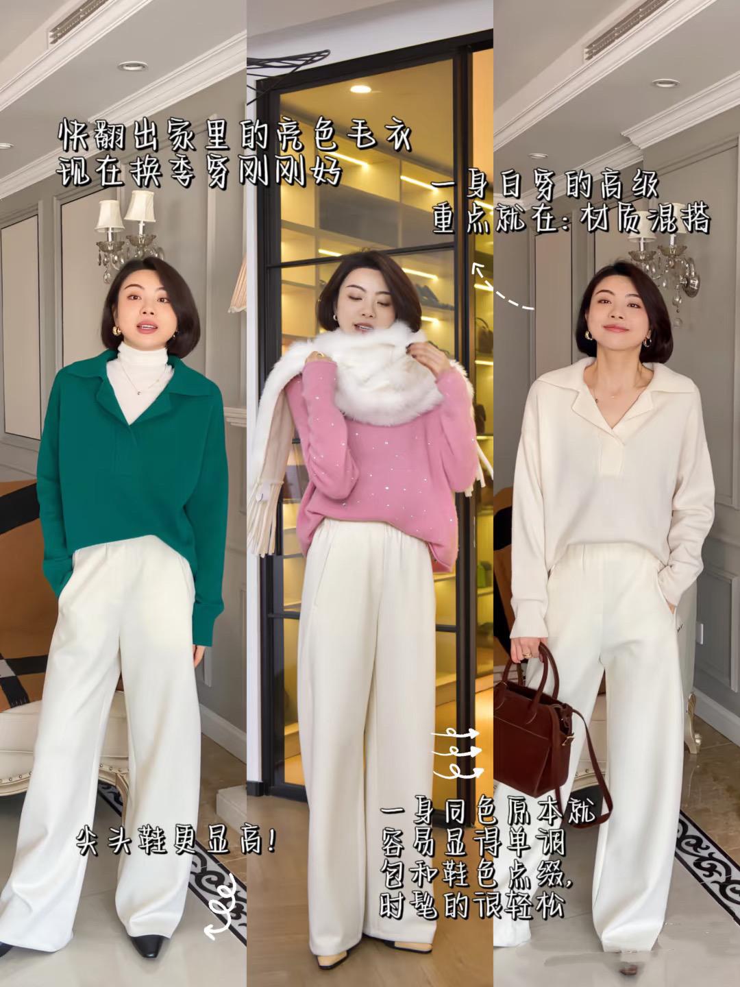 早春季節,乍暖還寒。如果喜歡比較溫暖的穿搭,我們可以嘗試更保暖的白色毛呢褲。白色毛呢褲不必選擇純白色、可以搭配柔和的米白色。