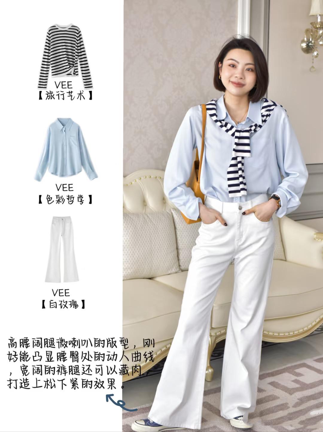 用淺藍色襯衫,來搭配高腰的直筒牛仔褲,簡單大方又顯腿長。白色的牛仔褲、可以嘗試選擇微喇褲的版型,更爲舒適顯腿長。