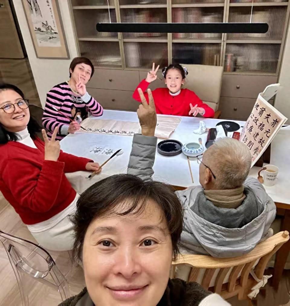 52歲吳越曬素顏照,全家湊一桌練書法,80多歲父親一看就是文化人