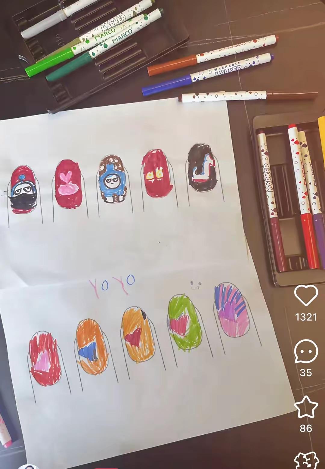 看孩子們設計的圖案,做成了漂亮的美甲,是不是還原度超高呢?這位美甲師也是超級厲害,劉璇做的美甲有點卡通,但這是孩子們的愛呀。